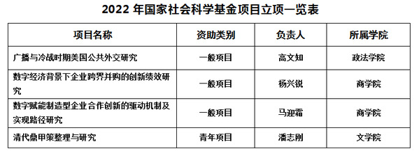 本网讯 近日,国家自然科学基金委员会、全国哲学社会科学工作办公室公布了2022年国家自然科学基金项目和国家社会科学基金项目评审结果,我校共有8项课题获得立项。此前,国家艺术基金管理中心公布了国家艺术基金(一般项目)2022年度资助项目名单,我校1个项目获得立项。截至目前,本年度我校共有9个国家基金项目获准立项。
